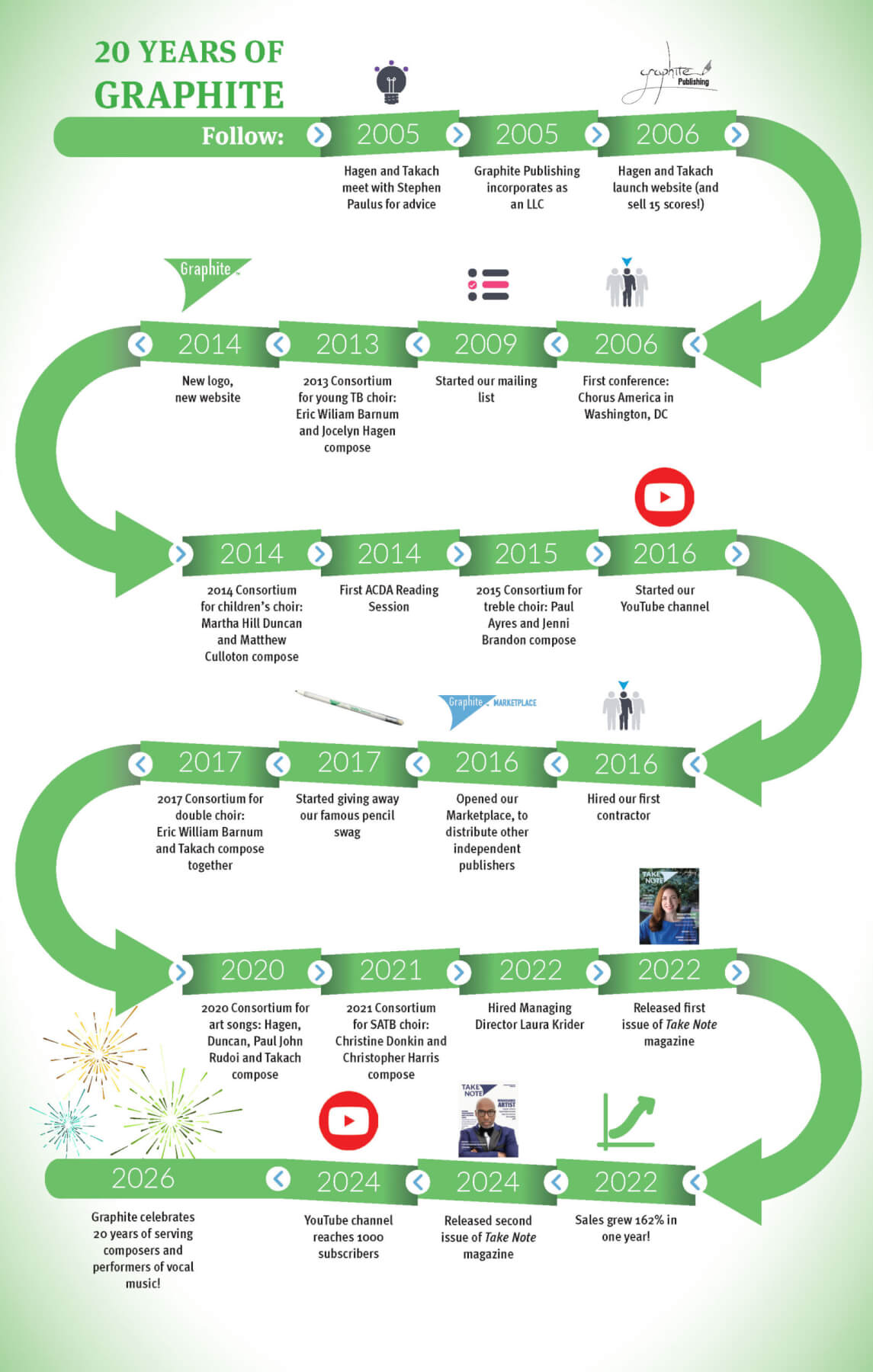 On this big anniversary, Hagen and Takach are looking ahead to the future. Hagen hopes to form a nonprofit arm of Graphite, one that supports diversity initiatives and serves as a mentor to independent composers who wish to publish with Graphite. The company also aims to one day offer support for school districts and other organizations with very low budgets, in the form of an initiative where Graphite could provide scores for free to these choirs but still pay composers their standard royalties.