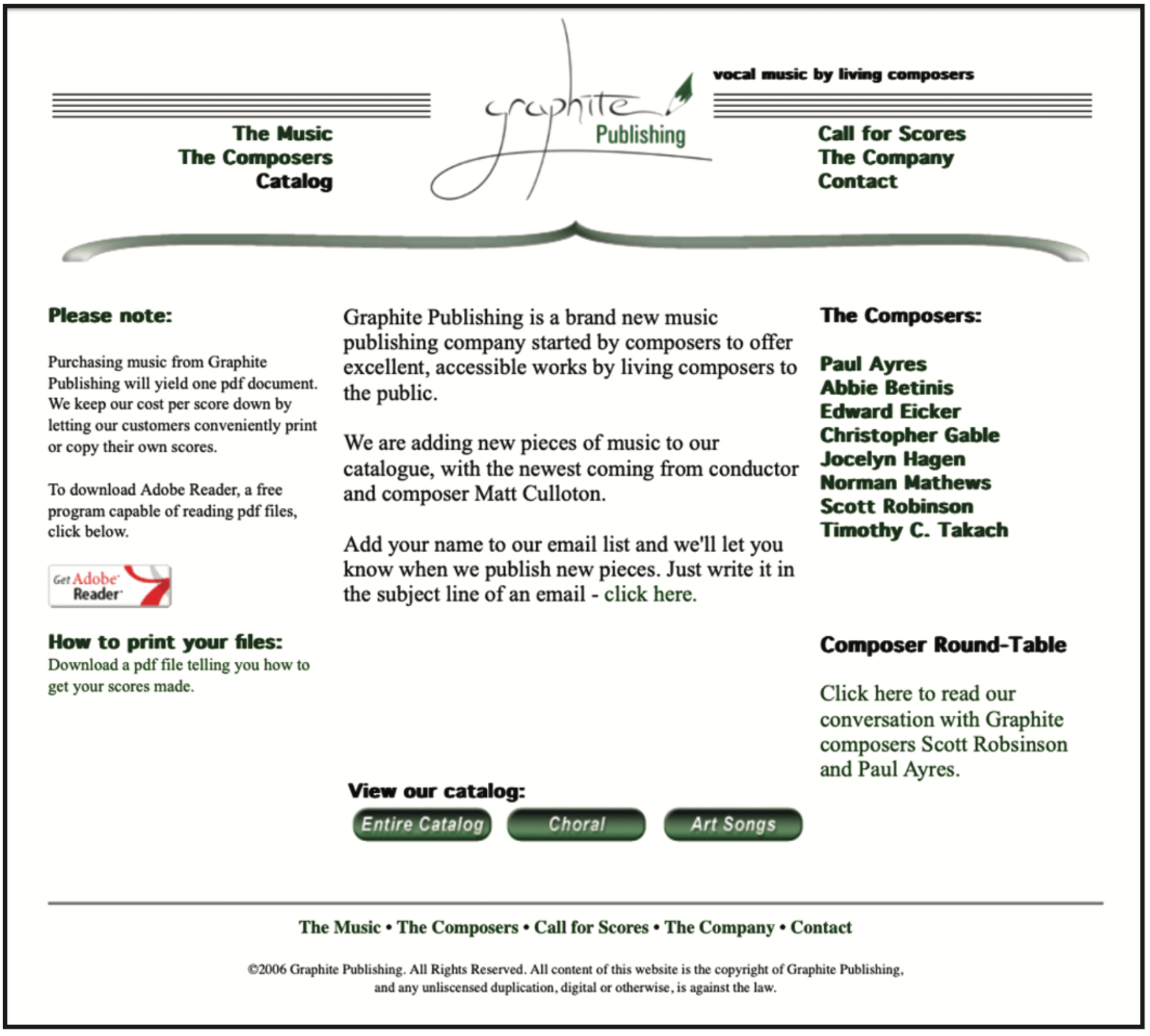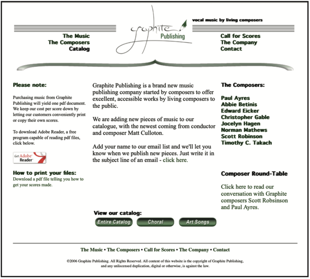 Takach launched the first website in early summer of 2006, then went to bed. The next morning, he woke up to Graphite’s first score sale. “It was a piece for tenor-bass choir, and I think it sold ten copies. I thought, ‘Oh my God, it’s working,’” he says. He still doesn’t know how the customer found a website that had gone online only twelve hours earlier, but it felt like a good sign.
