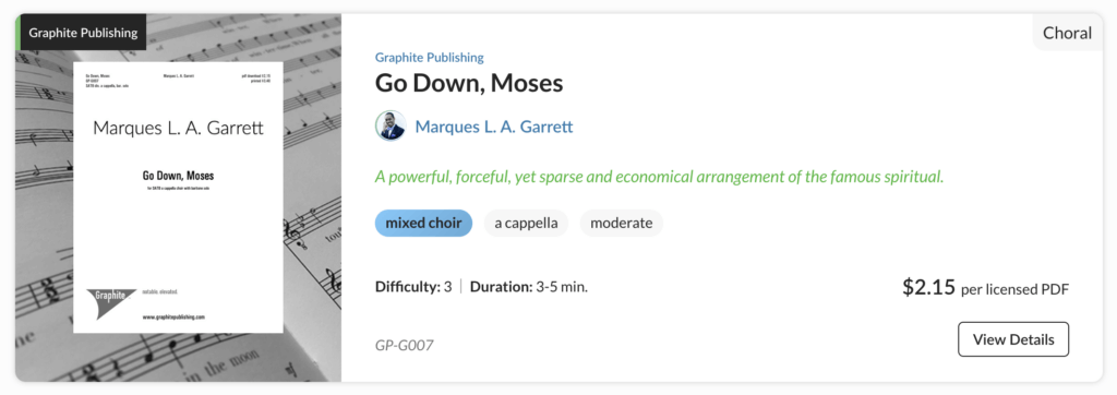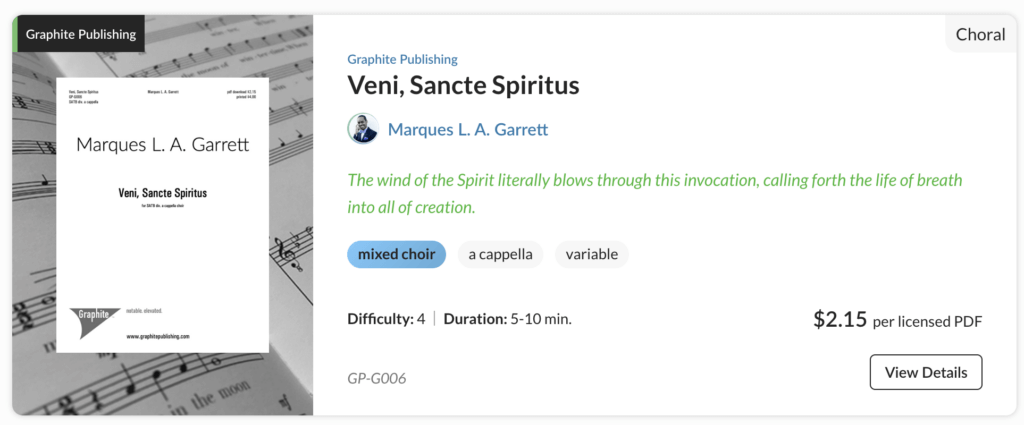 A versatile voice that performs both as a baritone and countertenor, Dr. Garrett has sung with several community, church, and university groups as both a chorister and soloist. Given his wide breadth of experience across the world of choral music, we asked him for a foundational nugget of wisdom to share with other artists. He encourages composers to be clear-eyed about their intended purpose with producing pieces: “Just because we produce art does not mean that everyone has to like it. If your goal is to make money, then you’re setting yourself up for a world of disappointment if you don’t write what people enjoy. (This does not mean that you must sacrifice who you are as an artist.)”