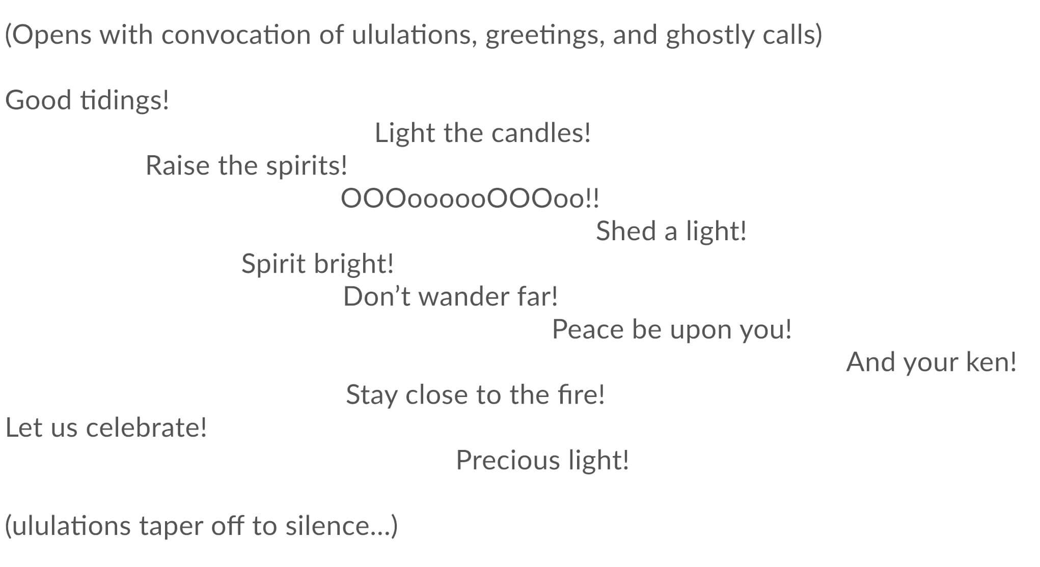 (Calls of “Yule!” race like flickering flames among the chorus fading to whispers no less intense. Chorus raises arms in final salutation to the rising sun as the celebration ends.)