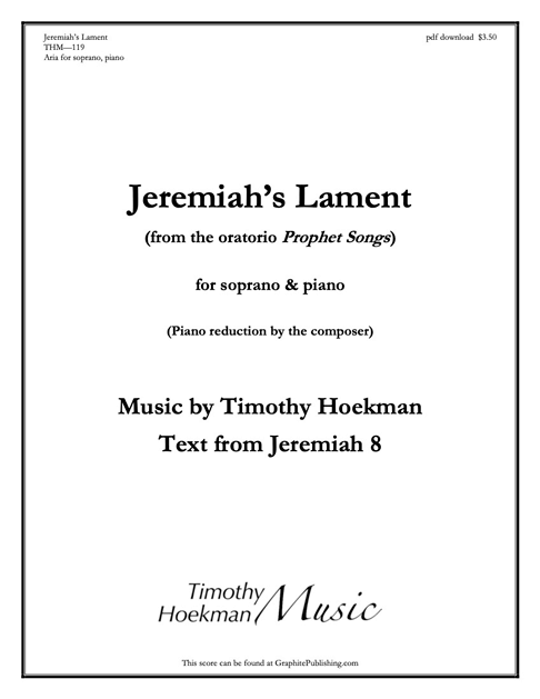 The full piano/vocal score of Prophet Songs and the orchestral score and parts are available from the composer at timothyhoekman@gmail.com.