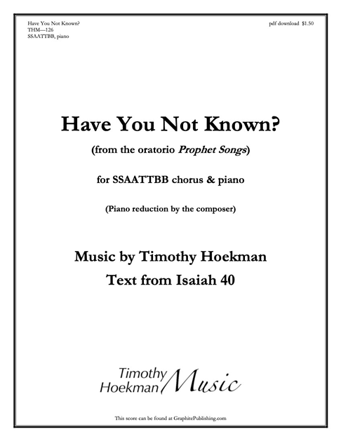 The full piano/vocal score of Prophet Songs and the orchestral score and parts are available from the composer at timothyhoekman@gmail.com.